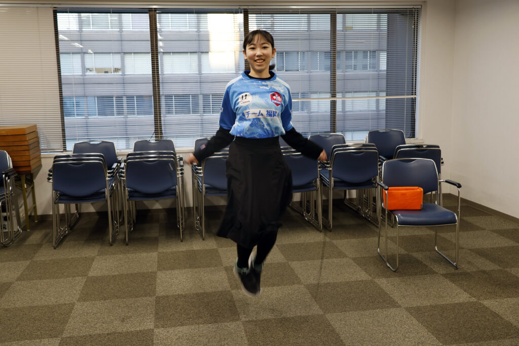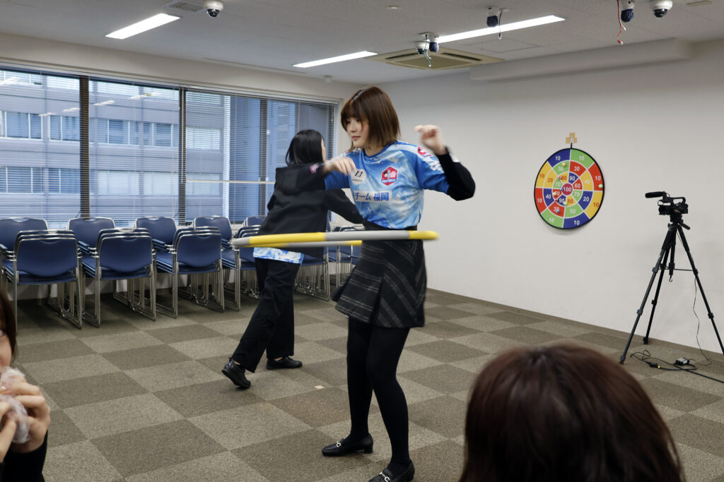 フラフープに夢中の選手もいれば、その後ろでは最年少の栁原咲輝二段が軽快な縄跳びを披露!若さを見せつけました。